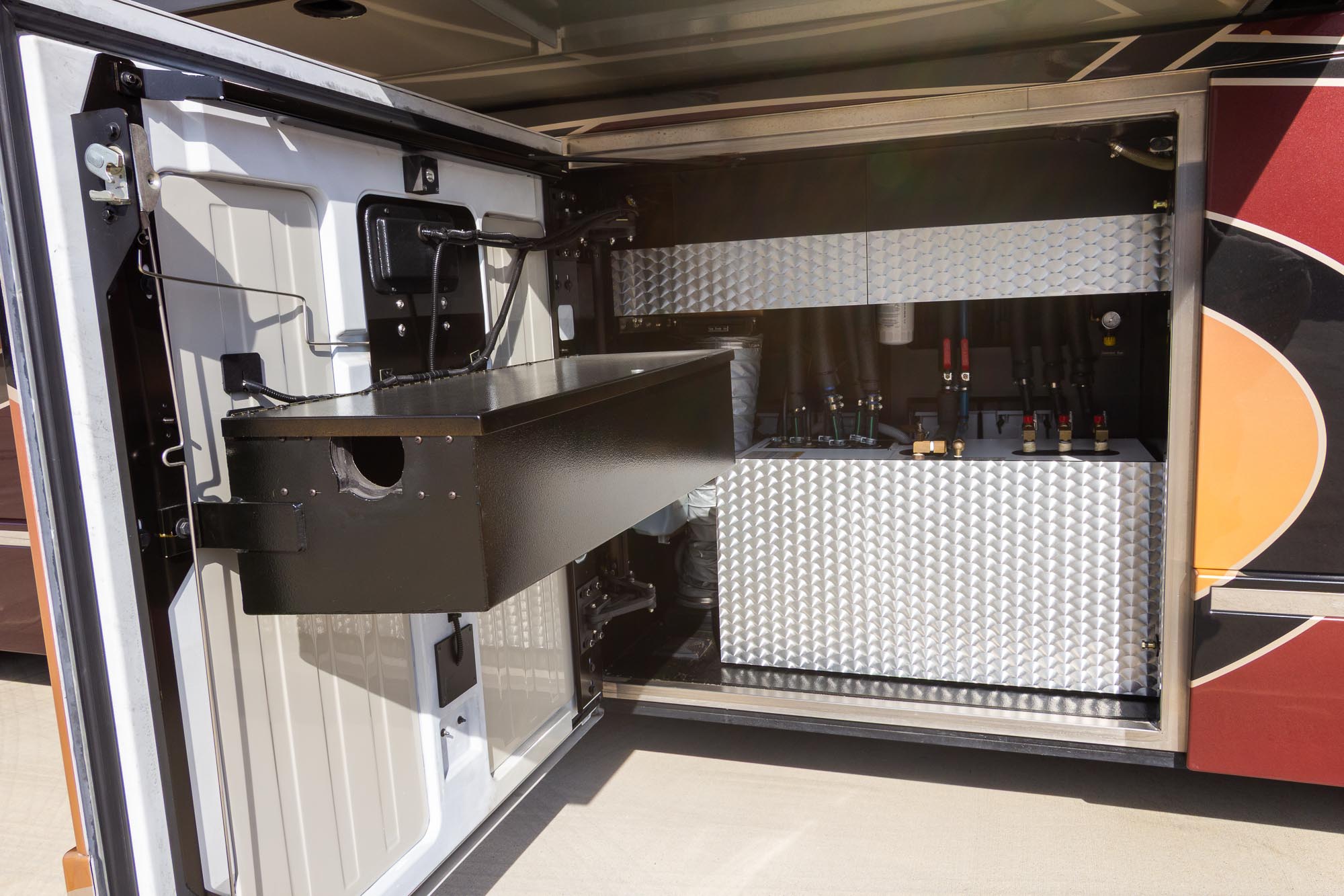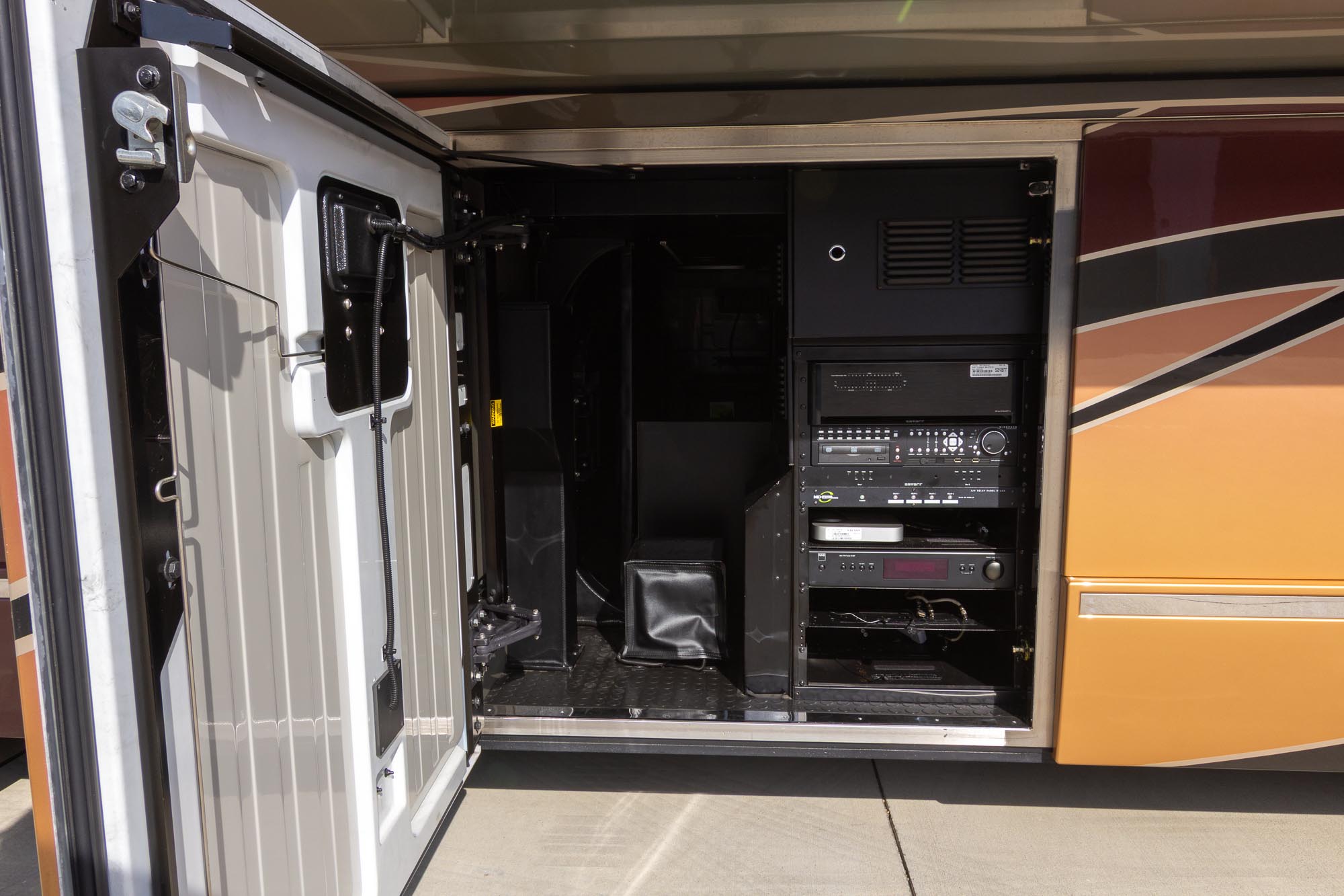 L- dinette, 4ea.Outback 3,500 watt inverters, Two burner stove, Granite shower, TV in the bedroom, Fold-down TV in the Living room, Air leveling, All electric coach, Stack washer/ Dryer, Series 60 Detroit, Allison 6 speed transmission, 20 KW generator, Roof mounted awnings,