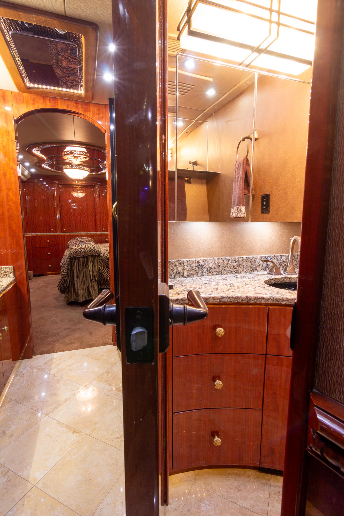 It’s an extremely nice clean coach. Tile flooring throughout the front of the coach, Custom counter top, and sink, Sofa, Euro recliner,